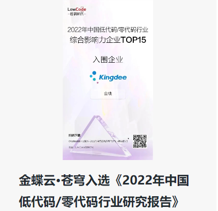 金蝶云·苍穹入选《2022年中国低代码/零代码行业研究报告》公司新闻, 新闻资讯作者:云蝶科技2022年7月5日近日,国内咨询机构LowCode低码时代发布了《中国低代码/零代码行业研究报告》。本次报告通过对行业的发展现状…